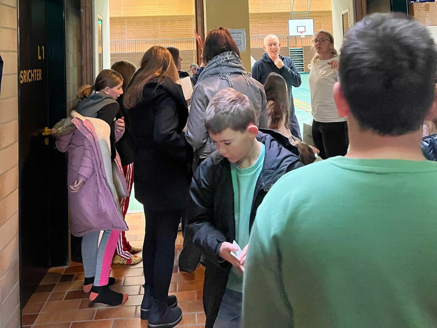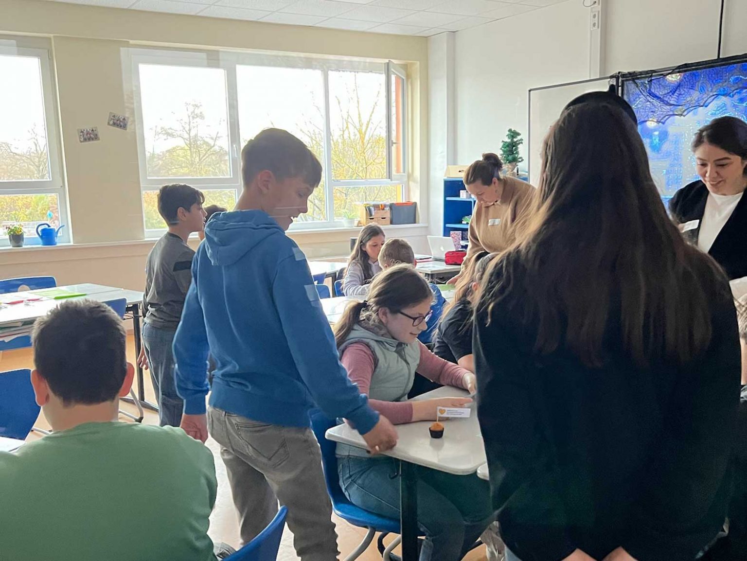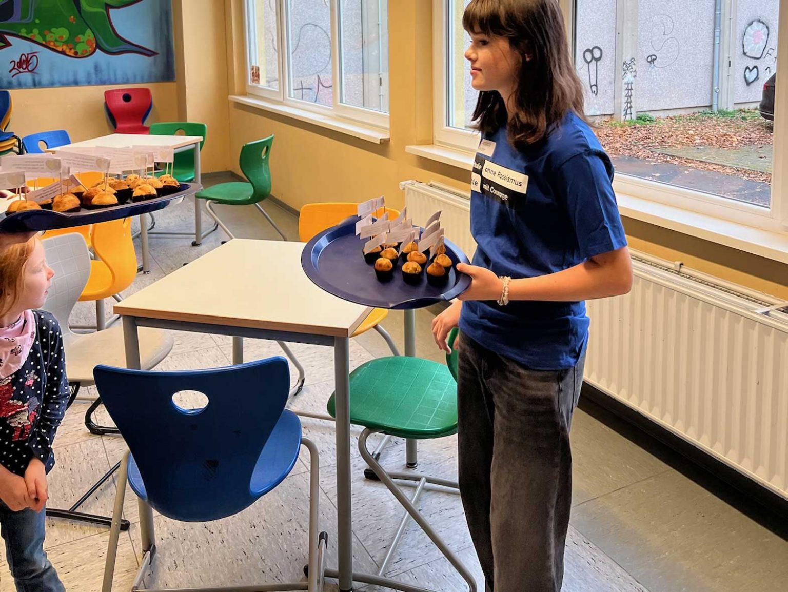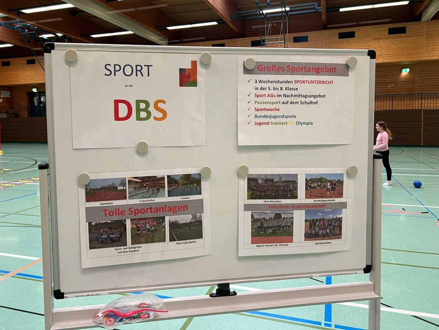Angeführt von Kolleginnen und Kollegen bekamen im ersten Teil der Veranstaltung die Grundschüler:innen in Kleingruppen durch einen geführten Stationsbetrieb in den Fächern Deutsch, Mathematik, Sprachen (Englisch, Französisch, Spanisch) und Sport einen Einblick in die Unterrichtspraxis an der DBS. Zwischendurch wurden die SuS noch von den Eltern des aktuellen Jahrgangs 5 und dem Vorstand des Elternbeirats in der Teestube mit einem Muffin verwöhnt.