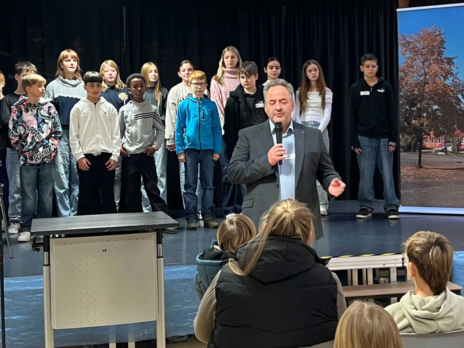 Zum Beginn der Veranstaltung stand fast schon traditionell der Vortrag des Drei-Burgen-Liedes durch die beiden Klassen 6 des Gymnasialzweigs und die Begrüßung der Gäste durch den Schulleiter Herrn Heidelbach. Der Direktor der Drei-Burgen-Schule war besonders stolz, dass ein weiterer Schritt zur Sanierung der Schule in Form der Umgestaltung des ehemaligen Computer- und GL-Raums zu einer neuen Lernwelt, getan wurde. Ab sofort ist in diesen neu gestalteten Räumen individuelles Arbeiten in einer neuen Form möglich. Dies wird die Qualität des Unterrichts weiter anheben. Darauf können sich auch unsere neuen SuS sich freuen!