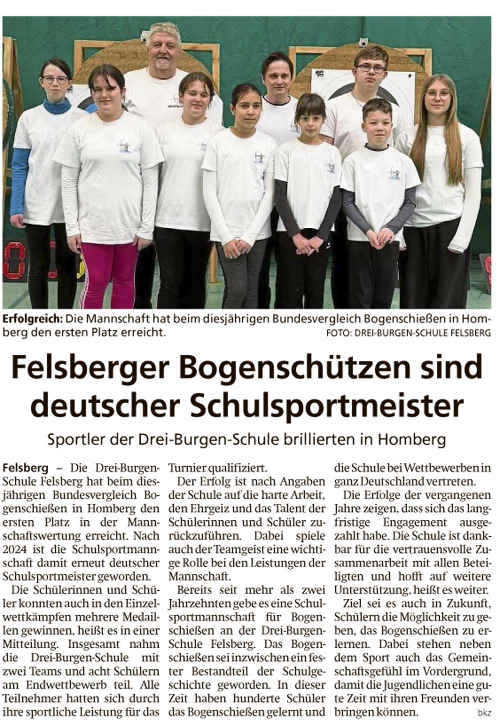 “Wir sind sehr stolz Ihnen mitteilen zu können, dass die Schulsport Mannschaft der Drei-Burgen-Schule Felsberg beim diesjährigen Bundesvergleich Bogenschießen in Homberg (Efze) den ersten Platz in der Mannschaftswertung erreicht hat und somit nach 2024 erneut deutscher Schulsportmeister geworden ist. Auch in den Einzelwettkämpfen konnten die Schüler*innen mehrere Medaillen gewinnen und zeigen, dass sich ihr hartes Training gelohnt hat.