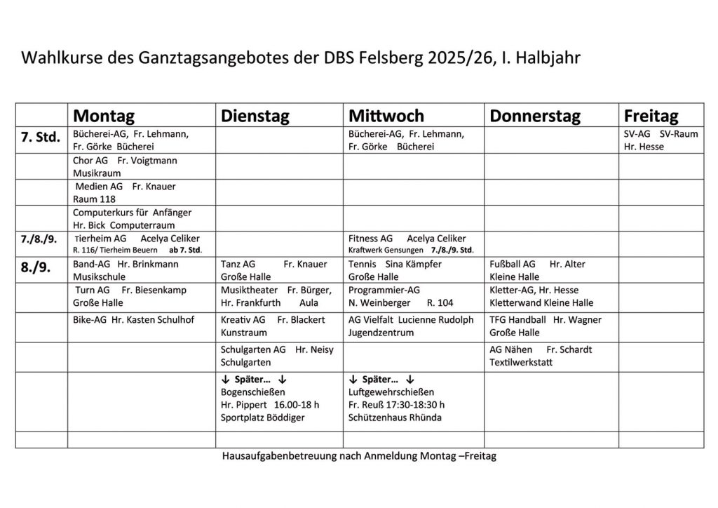 Die Wahlkurse sind jeweils auf ein Halbjahr oder ein Jahr ausgelegt, eine regelmäßige Teilnahme sollte selbstverständlich sein. Neben den Kursangeboten und dem Förderunterricht steht auch der Schülertreff mit Angeboten zum Spielen und Entspannen zur Verfügung. Außerdem gibt es täglich die Hausaufgabenhilfe, an der die Schüler nach Anmeldung kostenfrei teilnehmen können.