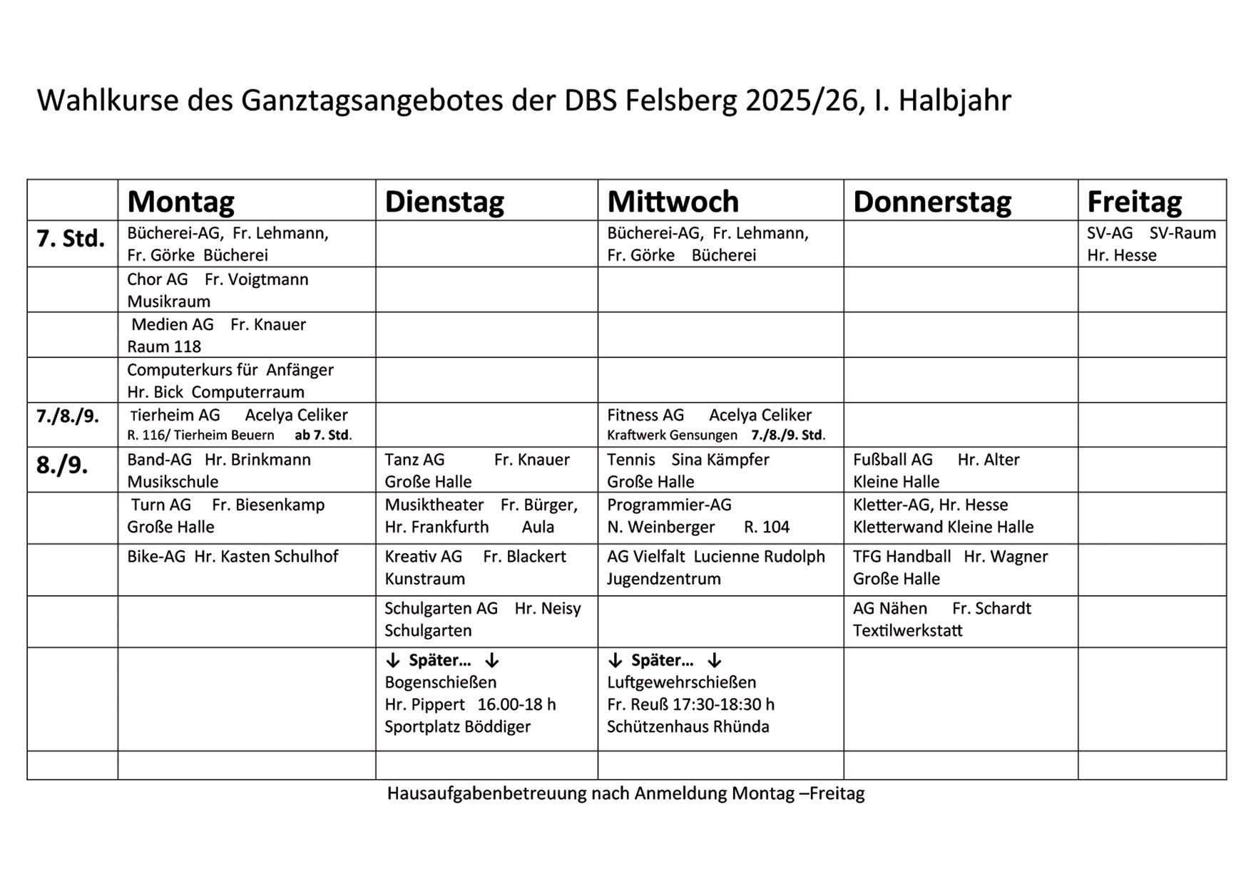 - Hausaufgabenbetreuung: Wir benötigen für die Hausaufgabenbetreuung eine namentliche Anmeldung.